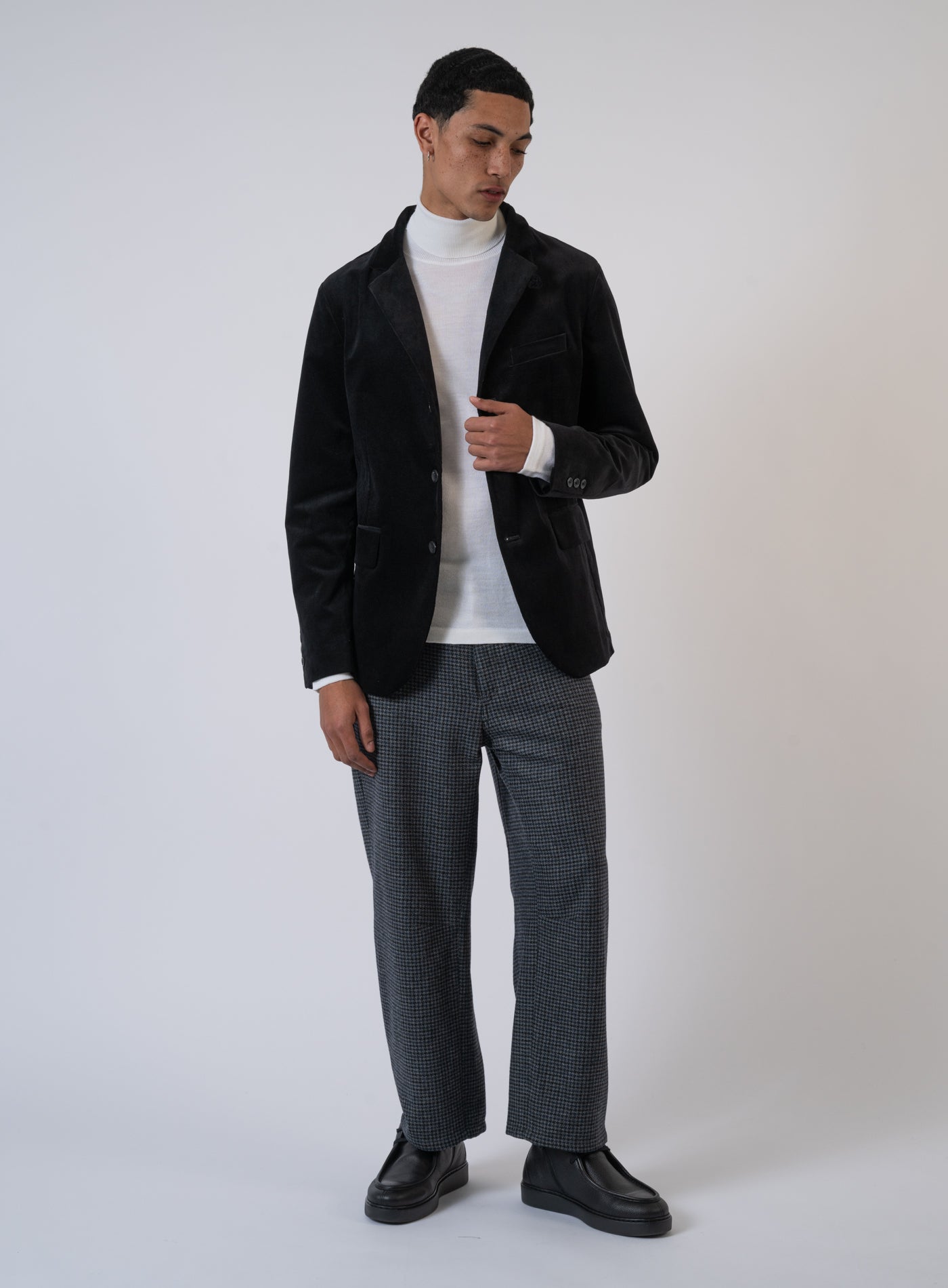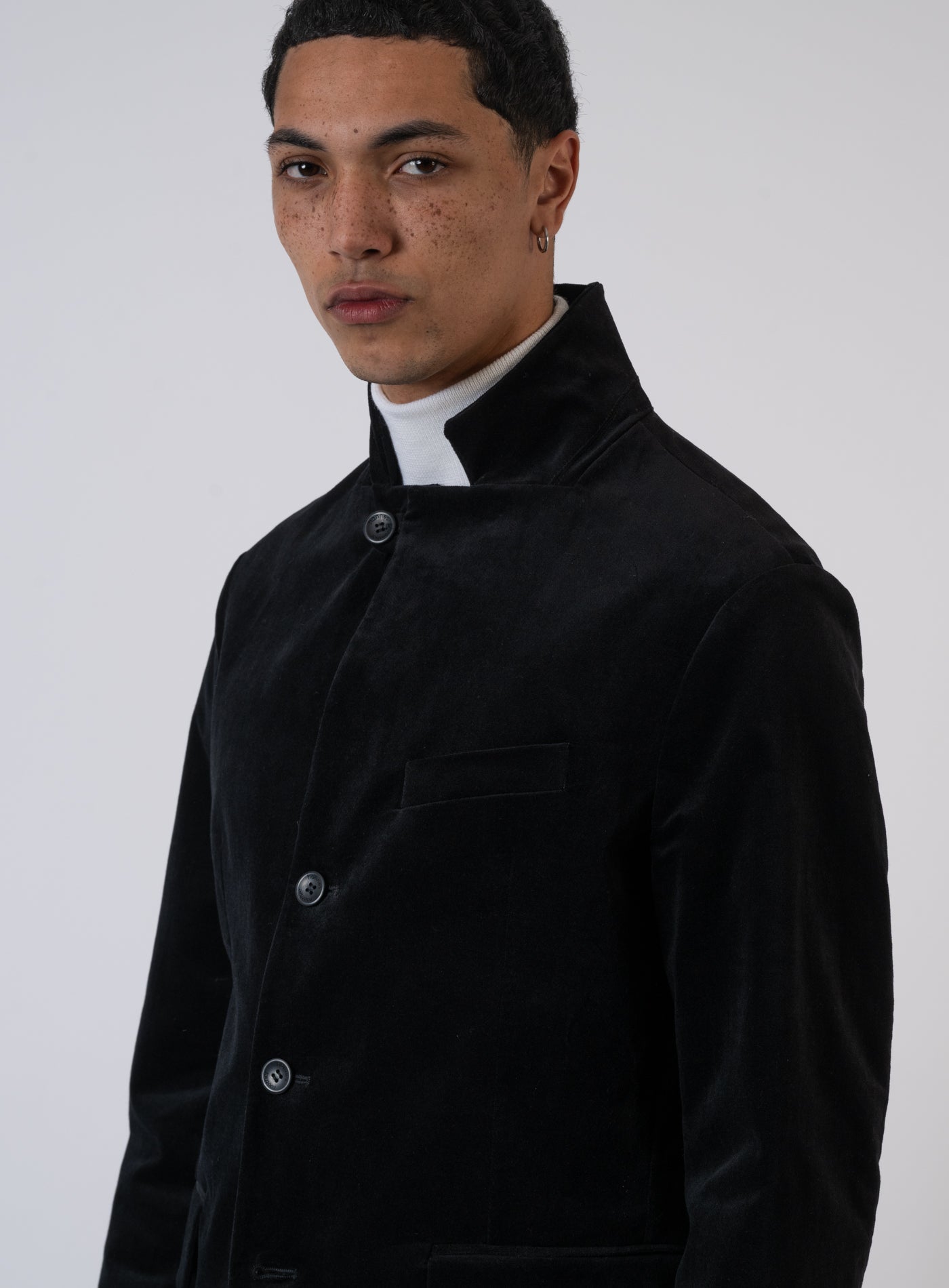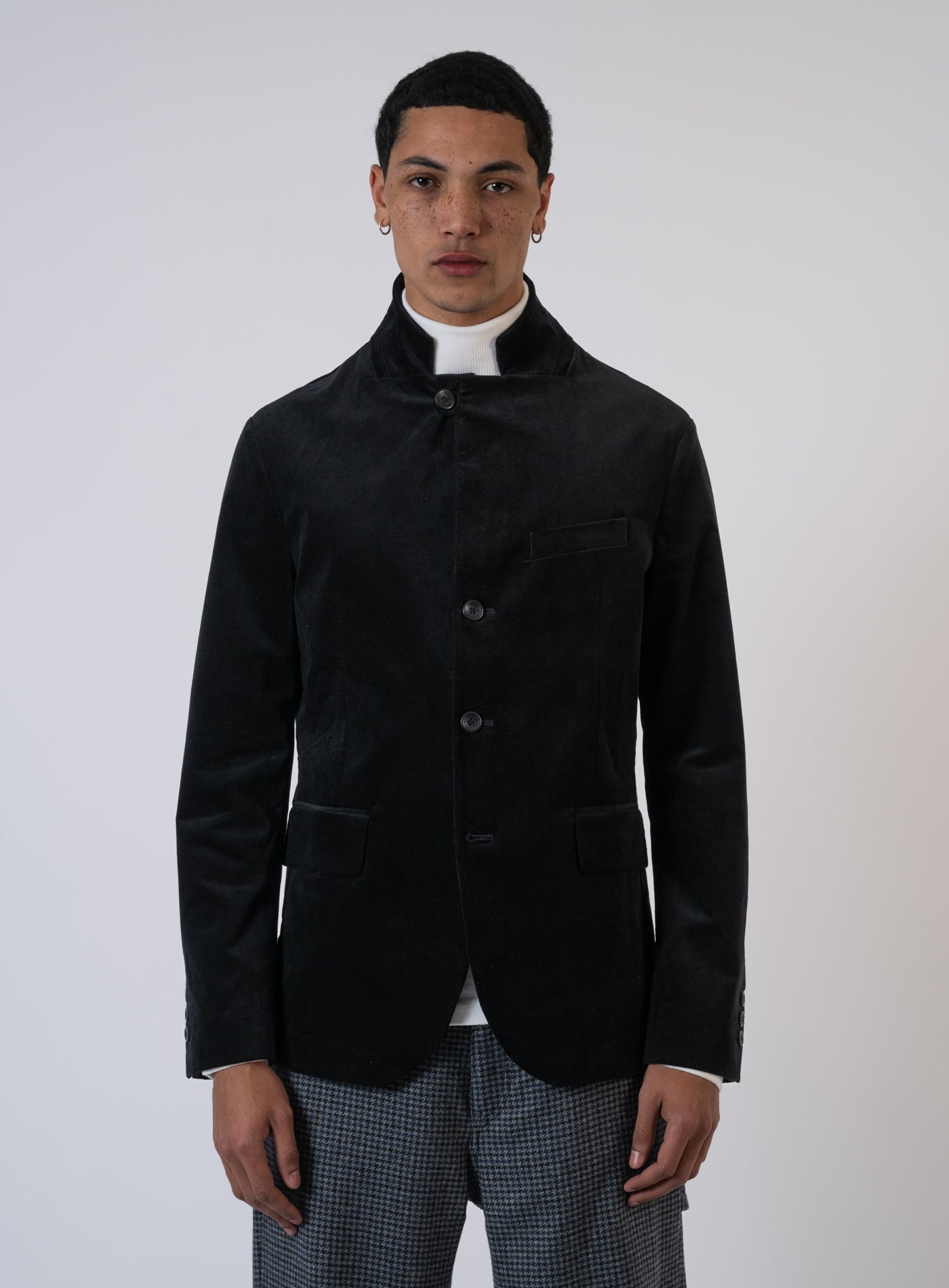 - Sakko von HANNES ROETHER - Stehkragen - Knopfleiste mit vier Knöpfen - Brusttasche mit Patte - Zwei Pattentaschen auf der Vorderseite - Ärmel mit Knopfdetails - Abgerundeter Saum vorne