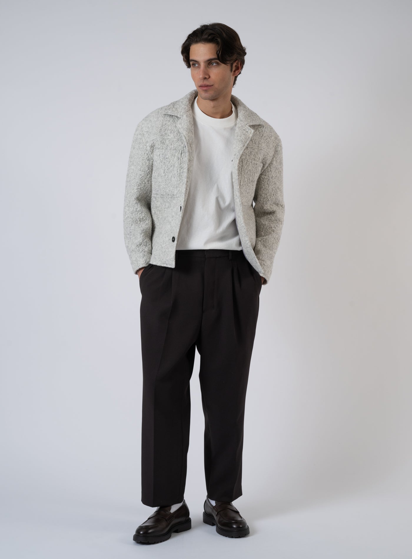 Oberstoff: 40% Baumwolle, 30% Schurwolle, 30% Polyester Futter: 100% Polyester